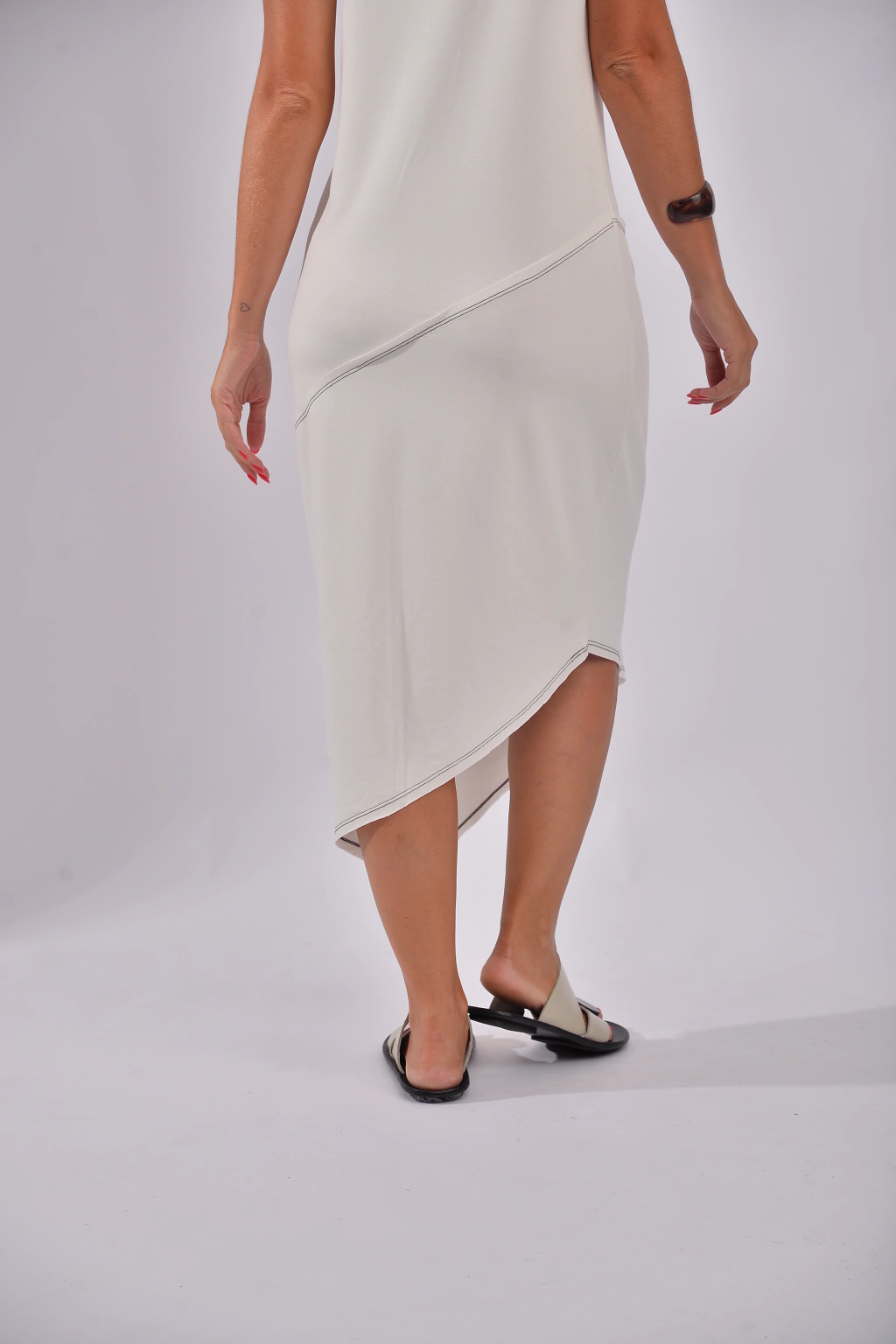 Vestido recorte diagonal assimétrico, todo pespontado na cor invertida e detalhe de ilhós na ponta lateral.