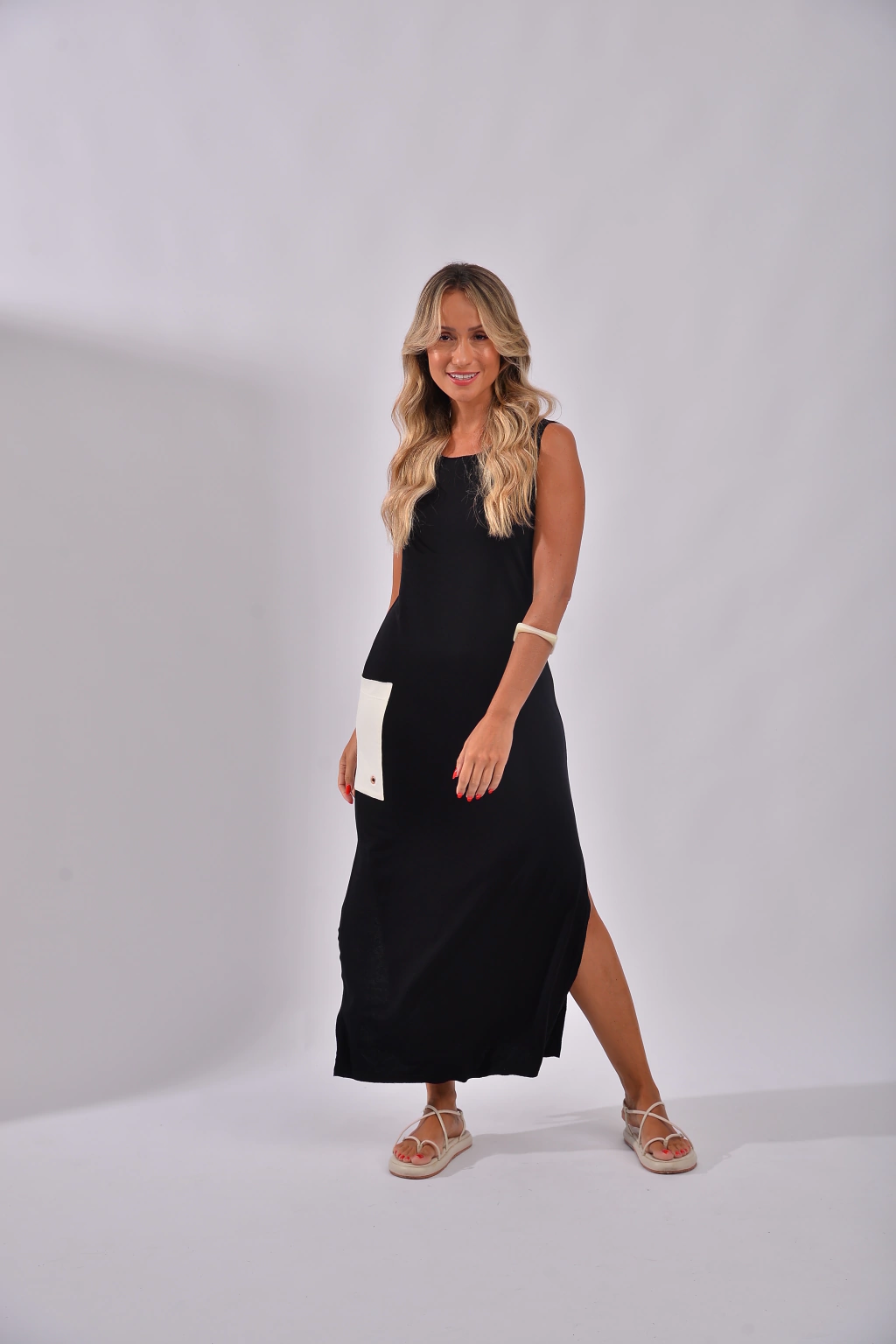 Vestido longo com fendas laterais e bolsão lateral bicolor com detalhe de ilhós cobre.