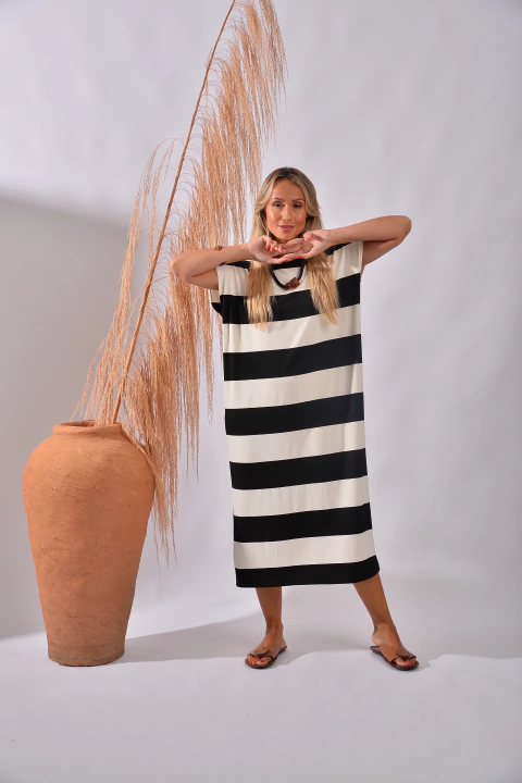 Vestido com modelagem reta e super larga com uma proposta de conforto absoluto. Padronagem listras largas. Detalhe de ilhós cobre na barra.